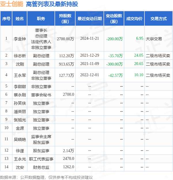 亞士創(chuàng)能的高管列表及最新持股情況如下: