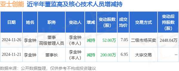 摘要: 消息,根據(jù)11月28日市場(chǎng)公開(kāi)信息、上市公司公告及交易所披露數(shù)據(jù)整理,亞士創(chuàng)能(603378)最新董監(jiān)高及相關(guān)人員股份變動(dòng)情況:2024年11月26日公司董事,高級(jí)管理人員李金鐘共減持公司股份52.0