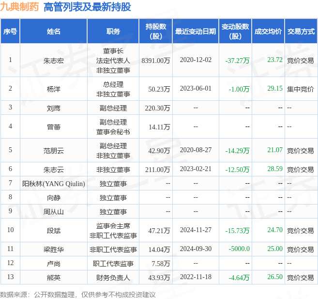 九典制藥的高管列表及最新持股情況如下: