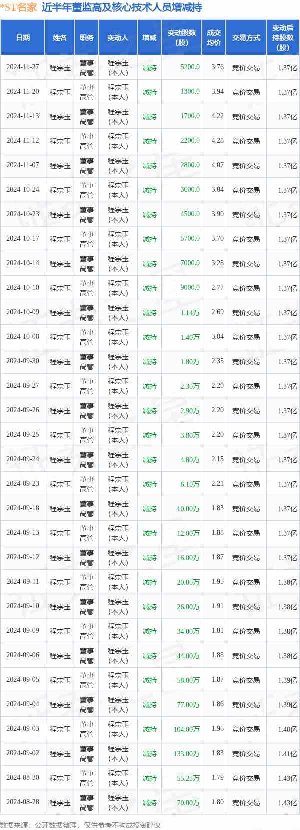 ST名家:11月27日高管程宗玉減持股份合計5200股