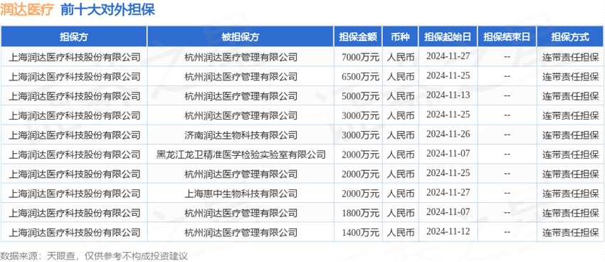 潤(rùn)達(dá)醫(yī)療12月2日披露24筆對(duì)外擔(dān)保,被擔(dān)保公司達(dá)13家。擔(dān)保金額排在前十的對(duì)外擔(dān)保明細(xì)如下表:
