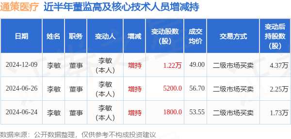 摘要: 消息,根據(jù)12月11日市場(chǎng)公開信息、上市公司公告及交易所披露數(shù)據(jù)整理,通策醫(yī)療(600763)最新董監(jiān)高及相關(guān)人員股份變動(dòng)情況:2024年12月9日公司董事李敏共增持公司股份1.22萬股,