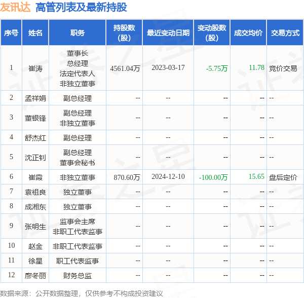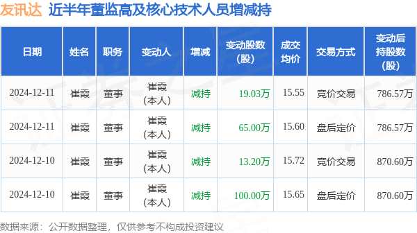 摘要: 消息,根據(jù)12月12日市場(chǎng)公開信息、上市公司公告及交易所披露數(shù)據(jù)整理,友訊達(dá)(300514)最新董監(jiān)高及相關(guān)人員股份變動(dòng)情況:2024年12月11日公司董事崔霞共減持公司股份84.03萬(wàn)股,
