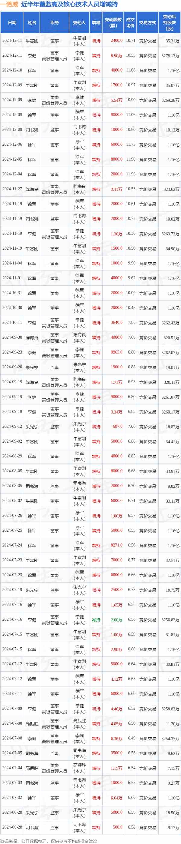 消息,根據(jù)12月13日市場公開信息、上市公司公告及交易所披露數(shù)據(jù)整理,一諾威(834261)最新董監(jiān)高及相關(guān)人員股份變動情況:2024年12月11日公司董事,高級管理人員李健、董事牛富剛共增持公司股份9.14萬股,占公司總股本為0.0314%。變動期間公司股價(jià)下跌4.21%,12月11日當(dāng)日收盤報(bào)10.47元。
