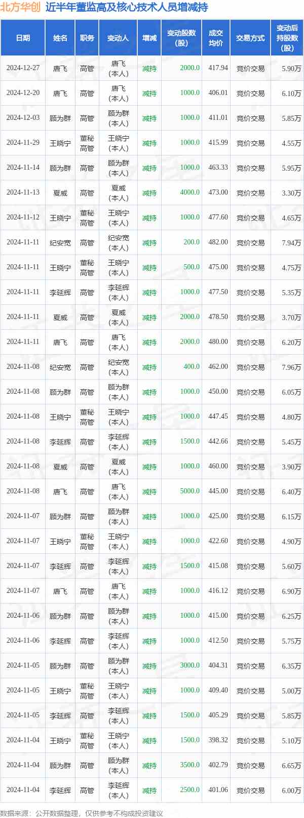 摘要: 消息,根據(jù)12月30日市場(chǎng)公開(kāi)信息、上市公司公告及交易所披露數(shù)據(jù)整理,北方華創(chuàng)(002371)最新董監(jiān)高及相關(guān)人員股份變動(dòng)情況:2024年12月27日公司高管唐飛共減持公司股份2000.0股,