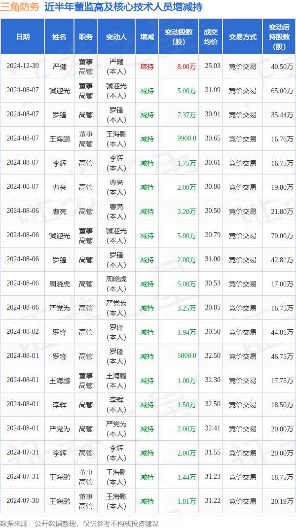 摘要: 消息,根據(jù)12月31日市場公開信息、上市公司公告及交易所披露數(shù)據(jù)整理,三角防務(wù)(300775)最新董監(jiān)高及相關(guān)人員股份變動情況:2024年12月30日公司董事,高管嚴(yán)健共增持公司股份8.0萬股,