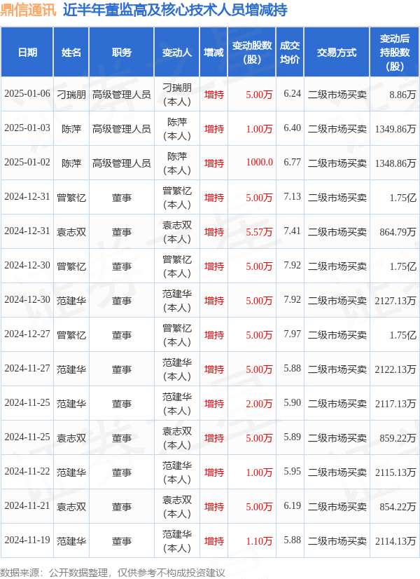 摘要: 消息,根據(jù)1月6日市場公開信息、上市公司公告及交易所披露數(shù)據(jù)整理,鼎信通訊(603421)最新董監(jiān)高及相關(guān)人員股份變動(dòng)情況:2025年1月6日公司高級管理人員刁瑞朋共增持公司股份5.0萬股,