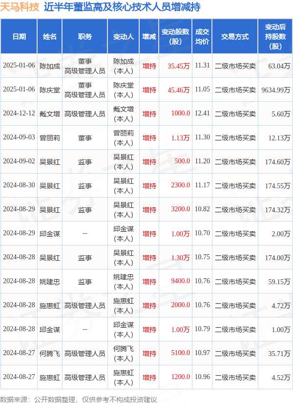 摘要: 消息,根據(jù)1月6日市場公開信息、上市公司公告及交易所披露數(shù)據(jù)整理,天馬科技(603668)最新董監(jiān)高及相關(guān)人員股份變動情況:2025年1月6日公司董事,高級管理人員陳慶堂、董事,高級管理人員陳加成共增