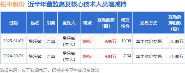 摘要: 消息,根據(jù)1月6日市場公開信息、上市公司公告及交易所披露數(shù)據(jù)整理,柘中股份(002346)最新董監(jiān)高及相關(guān)人員股份變動情況:2025年1月3日公司監(jiān)事吳承敏共增持公司股份9.99萬股,