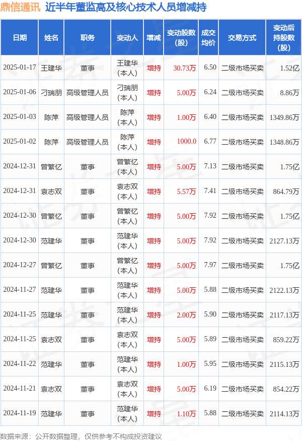 消息,根據(jù)1月20日市場公開信息、上市公司公告及交易所披露數(shù)據(jù)整理,鼎信通訊(603421)最新董監(jiān)高及相關(guān)人員股份變動情況:2025年1月17日公司董事王建華共增持公司股份30.73萬股,占公司總股本為0.0471%。變動期間公司股價下跌2.41%,1月17日當(dāng)日收盤報6.49元。
