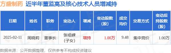 摘要: 消息,根據(jù)2月11日市場(chǎng)公開信息、上市公司公告及交易所披露數(shù)據(jù)整理,方盛制藥(603998)最新董監(jiān)高及相關(guān)人員股份變動(dòng)情況:2025年2月11日公司董事長(zhǎng)周曉莉的親屬共增持公司股份1.0萬股,