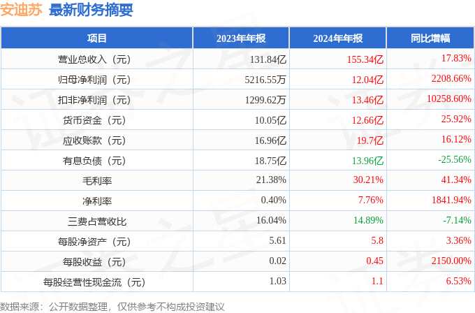 摘要: 據(jù)公開數(shù)據(jù)整理,近期安迪蘇(600299)發(fā)布2024年年報。截至本報告期末,公司營業(yè)總收入155.34億元,同比上升17.83%,歸母凈利潤12.04億元,同比上升2208.66%。