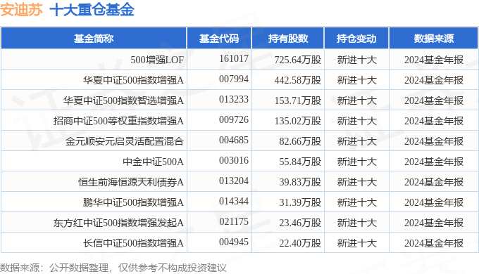 持有安迪蘇最多的基金為500增強LOF,目前規(guī)模為63.28億元,最新凈值1.972(2月28日),較上一交易日下跌2.47%,近一年上漲10.03%。該基金現(xiàn)任基金經(jīng)理為李笑薇 徐幼華 方旻。