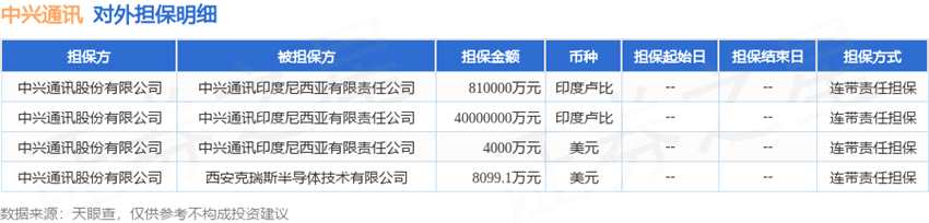 中興通訊2月28日披露4筆對(duì)外擔(dān)保,被擔(dān)保公司2家。對(duì)外擔(dān)保明細(xì)如下表: