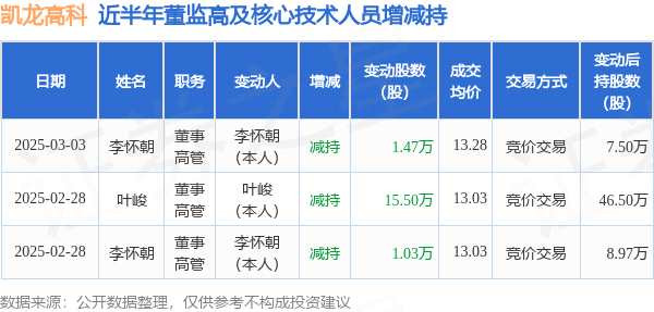 摘要: 消息,根據(jù)3月4日市場(chǎng)公開信息、上市公司公告及交易所披露數(shù)據(jù)整理,凱龍高科(300912)最新董監(jiān)高及相關(guān)人員股份變動(dòng)情況:2025年3月3日公司董事,高管李懷朝共減持公司股份1.47萬股,