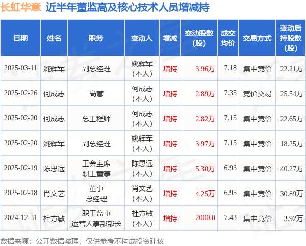 摘要: 消息,根據(jù)3月12日市場(chǎng)公開(kāi)信息、上市公司公告及交易所披露數(shù)據(jù)整理,長(zhǎng)虹華意(000404)最新董監(jiān)高及相關(guān)人員股份變動(dòng)情況:2025年3月11日公司副總經(jīng)理姚輝軍共增持公司股份3.96萬(wàn)股,