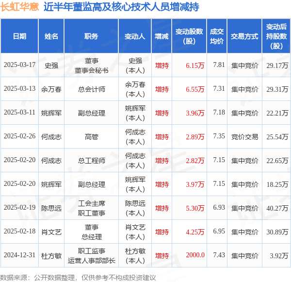 摘要: 消息,根據(jù)3月18日市場公開信息、上市公司公告及交易所披露數(shù)據(jù)整理,長虹華意(000404)最新董監(jiān)高及相關(guān)人員股份變動(dòng)情況:2025年3月17日公司董事,董事會(huì)秘書史強(qiáng)共增持公司股份6.15萬股,