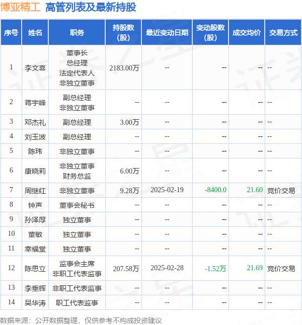 博亞精工的高管列表及最新持股情況如下: