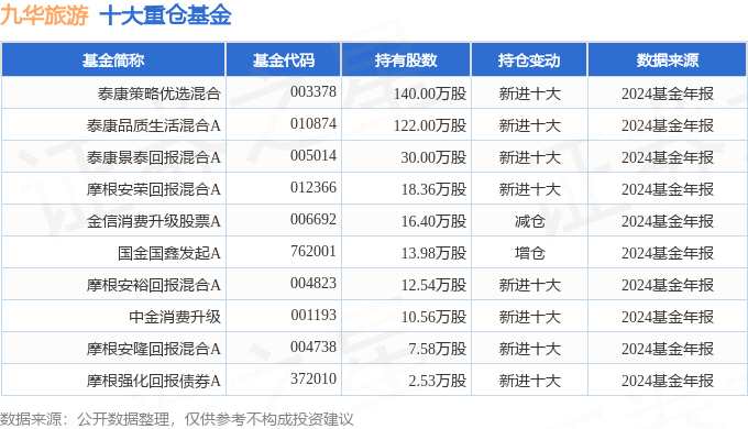 持有九華旅游最多的基金為泰康策略優(yōu)選混合,目前規(guī)模為12.45億元,最新凈值1.7104(3月18日),較上一交易日上漲1.8%,近一年上漲11.4%。該基金現(xiàn)任基金經(jīng)理為宋仁杰。