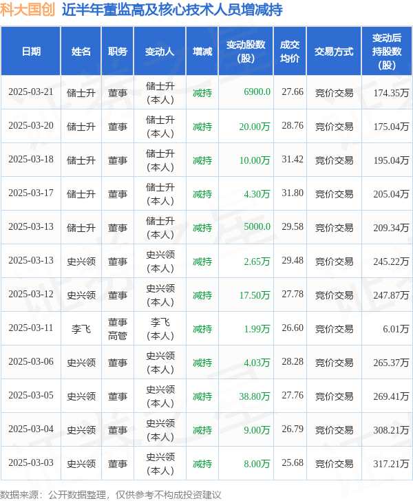 摘要: 消息,根據(jù)3月24日市場(chǎng)公開(kāi)信息、上市公司公告及交易所披露數(shù)據(jù)整理,科大國(guó)創(chuàng)(300520)最新董監(jiān)高及相關(guān)人員股份變動(dòng)情況:2025年3月21日公司董事儲(chǔ)士升共減持公司股份6900.0股,