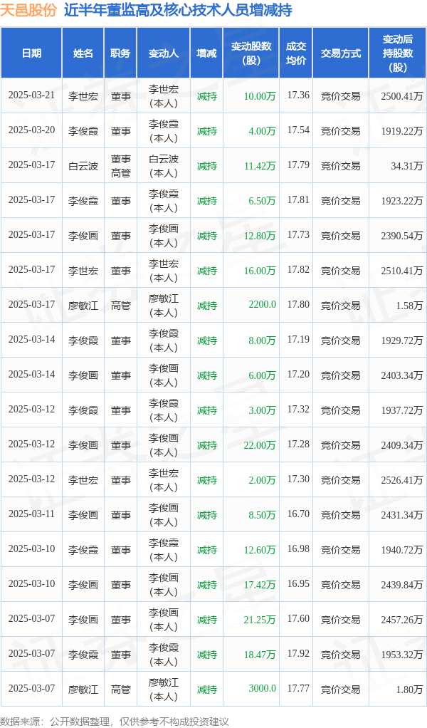 摘要: 消息,根據(jù)3月24日市場(chǎng)公開(kāi)信息、上市公司公告及交易所披露數(shù)據(jù)整理,天邑股份(300504)最新董監(jiān)高及相關(guān)人員股份變動(dòng)情況:2025年3月21日公司董事李世宏共減持公司股份10.0萬(wàn)股,
