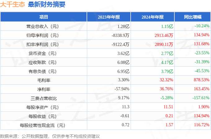 摘要: 據(jù)公開數(shù)據(jù)整理,近期大千生態(tài)(603955)發(fā)布2024年年報。截至本報告期末,公司營業(yè)總收入1.15億元,同比下降10.24%,歸母凈利潤2913.46萬元,同比上升134.94%。