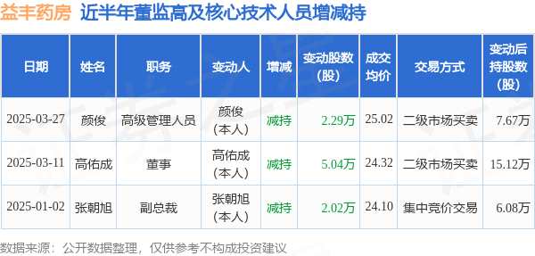 益豐藥房近半年內(nèi)的董監(jiān)高及核心技術(shù)人員增減持詳情如下: