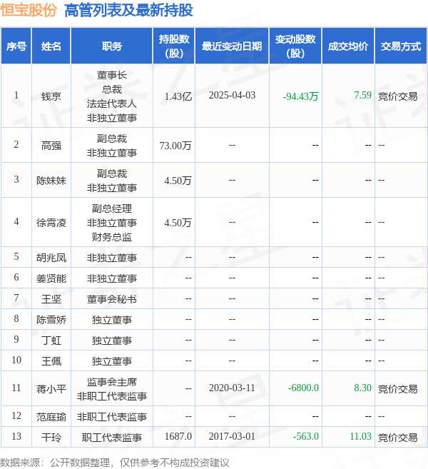 摘要: 消息,根據(jù)4月7日市場(chǎng)公開信息、上市公司公告及交易所披露數(shù)據(jù)整理,恒寶股份(002104)最新董監(jiān)高及相關(guān)人員股份變動(dòng)情況:2025年4月3日公司董事,高管錢京共減持公司股份94.43萬股,
