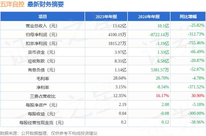 據(jù)公開(kāi)數(shù)據(jù)整理,近期五洋自控(300420)發(fā)布2024年年報(bào)。截至本報(bào)告期末,公司營(yíng)業(yè)總收入10.1億元,同比下降25.82%,歸母凈利潤(rùn)-8722.14萬(wàn)元,同比下降312.73%。按單季度數(shù)據(jù)看,第四季度營(yíng)業(yè)總收入3.31億元,同比下降19.42%,第四季度歸母凈利潤(rùn)-7496.39萬(wàn)元,同比下降2187.26%。本報(bào)告期五洋自控三費(fèi)占比上升明顯,財(cái)務(wù)費(fèi)用、銷(xiāo)售費(fèi)用和管理費(fèi)用總和占總營(yíng)收同比增幅達(dá)30.9%。