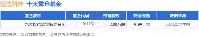 持有運(yùn)達(dá)科技最多的基金為光大保德信錦弘混合A,目前規(guī)模為0.28億元,最新凈值1.1616(4月18日),較上一交易日上漲0.15%,近一年上漲11.71%。該基金現(xiàn)任基金經(jīng)理為王衛(wèi)林。
