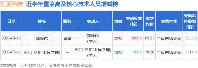 摘要: 消息,根據(jù)4月21日市場公開信息、上市公司公告及交易所披露數(shù)據(jù)整理,匯頂科技(603160)最新董監(jiān)高及相關人員股份變動情況:2025年4月16日公司董事郭峰偉共增持公司股份5000.0股,