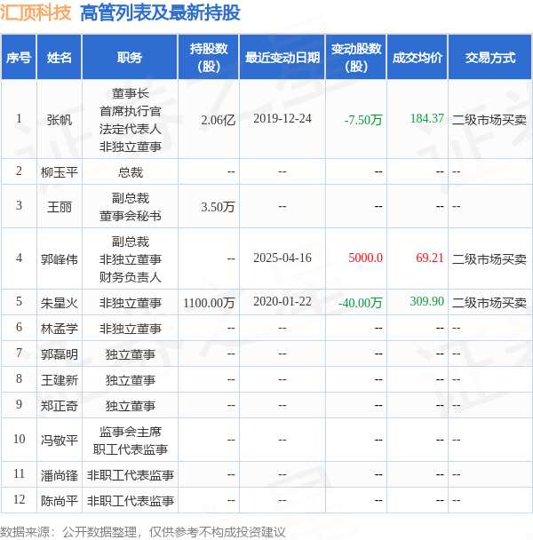 匯頂科技的高管列表及最新持股情況如下:
