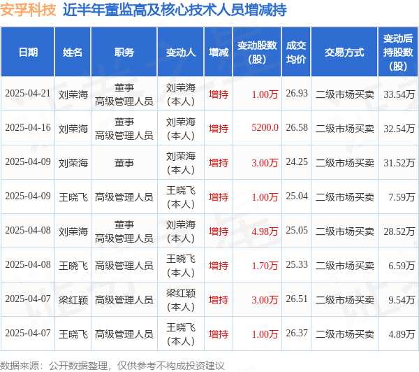 摘要: 消息,根據(jù)4月22日市場公開信息、上市公司公告及交易所披露數(shù)據(jù)整理,安孚科技(603031)最新董監(jiān)高及相關(guān)人員股份變動情況:2025年4月21日公司董事,高級管理人員劉榮海共增持公司股份1.0萬股,