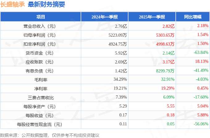據(jù)公開數(shù)據(jù)整理,近期長盛軸承(300718)發(fā)布2025年一季報。截至本報告期末,公司營業(yè)總收入2.82億元,同比上升2.18%,歸母凈利潤5303.65萬元,同比上升1.54%。按單季度數(shù)據(jù)看,第一季度營業(yè)總收入2.82億元,同比上升2.18%,第一季度歸母凈利潤5303.65萬元,同比上升1.54%。本報告期長盛軸承公司應(yīng)收賬款體量較大,當(dāng)期應(yīng)收賬款占最新年報歸母凈利潤比達138.58%。
