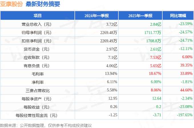 摘要: 據(jù)公開數(shù)據(jù)整理,近期亞康股份(301085)發(fā)布2025年一季報(bào)。截至本報(bào)告期末,公司營(yíng)業(yè)總收入2.84億元,同比下降23.59%,歸母凈利潤(rùn)1711.77萬元,同比下降24.57%。