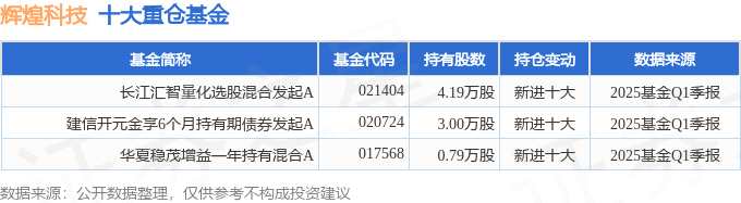 持有輝煌科技最多的基金為長江匯智量化選股混合發(fā)起A,目前規(guī)模為0.2億元,最新凈值1.1427(4月25日),較上一交易日上漲0.66%。該基金現(xiàn)任基金經(jīng)理為張帥。