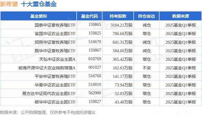 持有新希望最多的基金為國泰中證畜牧養(yǎng)殖ETF,目前規(guī)模為32.05億元,最新凈值0.5886(4月25日),較上一交易日下跌0.47%,近一年下跌3.98%。該基金現(xiàn)任基金經(jīng)理為梁杏。