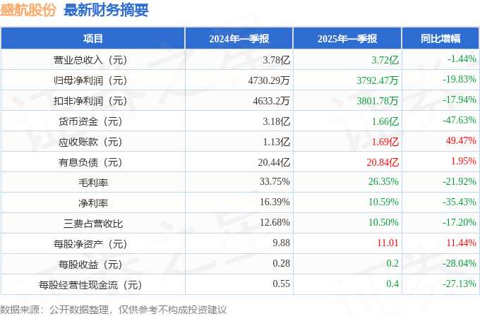 摘要: 據公開數據整理,近期盛航股份(001205)發(fā)布2025年一季報。截至本報告期末,公司營業(yè)總收入3.72億元,同比下降1.44%,歸母凈利潤3792.47萬元,同比下降19.83%。