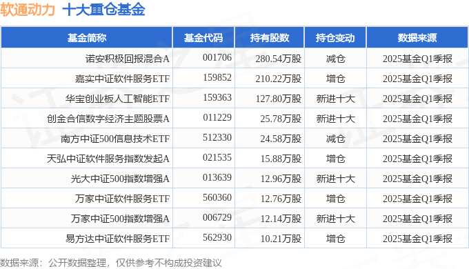持有軟通動(dòng)力最多的基金為諾安積極回報(bào)混合A,目前規(guī)模為15.77億元,最新凈值2.001(4月30日),較上一交易日上漲3.36%,近一年下跌1.62%。該基金現(xiàn)任基金經(jīng)理為劉慧影。