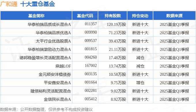 持有廣和通最多的基金為華泰柏瑞品質(zhì)成長混合A,目前規(guī)模為12.24億元,最新凈值0.5984(4月30日),較上一交易日上漲2.96%,近一年上漲5.1%。該基金現(xiàn)任基金經(jīng)理為沈雪峰。