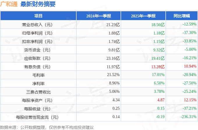摘要: 據(jù)公開數(shù)據(jù)整理,近期廣和通(300638)發(fā)布2025年一季報。截至本報告期末,公司營業(yè)總收入18.56億元,同比下降12.59%,歸母凈利潤1.18億元,同比下降37.3%。