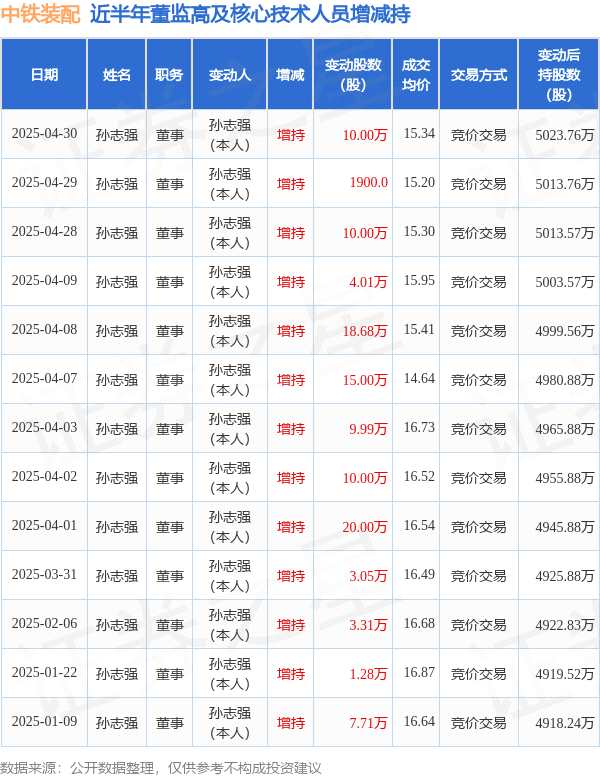 摘要: 消息,根據(jù)5月6日市場公開信息、上市公司公告及交易所披露數(shù)據(jù)整理,中鐵裝配(300374)最新董監(jiān)高及相關(guān)人員股份變動情況:2025年4月30日公司董事孫志強(qiáng)共增持公司股份10.0萬股,