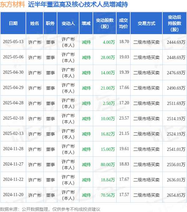 消息,根據(jù)5月16日市場(chǎng)公開信息、上市公司公告及交易所披露數(shù)據(jù)整理,東方材料(603110)最新董監(jiān)高及相關(guān)人員股份變動(dòng)情況:2025年5月13日公司董事許廣彬共減持公司股份4.0萬股,占公司總股本為0.0199%。變動(dòng)期間公司股價(jià)下跌0.39%,5月13日當(dāng)日收盤報(bào)17.93元。