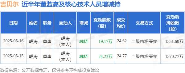 摘要: 消息,根據(jù)5月19日市場公開信息、上市公司公告及交易所披露數(shù)據(jù)整理,吉貝爾(688566)最新董監(jiān)高及相關(guān)人員股份變動情況:2025年5月16日公司董事胡濤共減持公司股份19.17萬股,