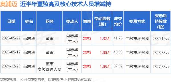摘要: 消息,根據(jù)5月22日市場公開信息、上市公司公告及交易所披露數(shù)據(jù)整理,奧浦邁(688293)最新董監(jiān)高及相關(guān)人員股份變動情況:2025年5月22日公司董事肖志華共增持公司股份1.32萬股,