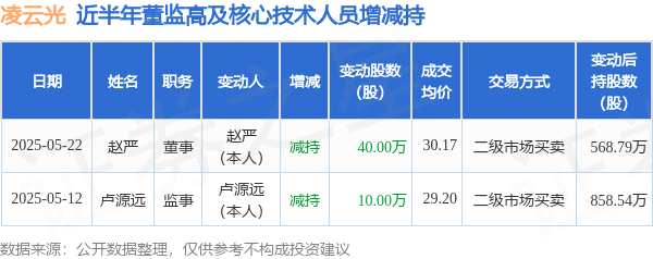 摘要: 消息,根據(jù)5月22日市場(chǎng)公開信息、上市公司公告及交易所披露數(shù)據(jù)整理,凌云光(688400)最新董監(jiān)高及相關(guān)人員股份變動(dòng)情況:2025年5月12日至2025年5月22日公司董事趙嚴(yán)、監(jiān)事盧源遠(yuǎn)共減持公司