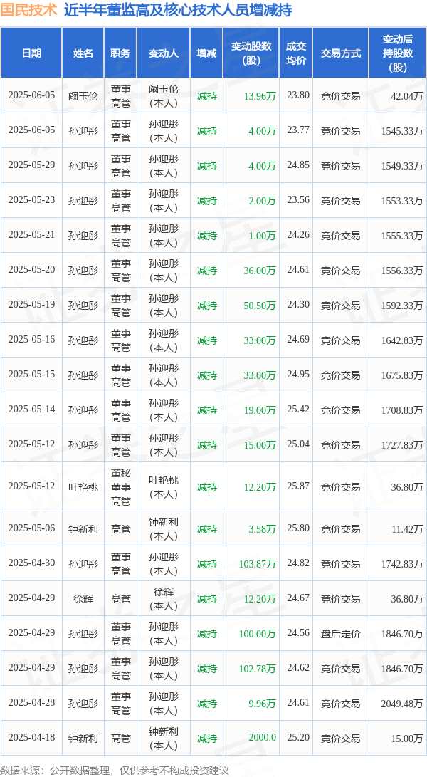 摘要: 消息,根據(jù)6月6日市場(chǎng)公開(kāi)信息、上市公司公告及交易所披露數(shù)據(jù)整理,國(guó)民技術(shù)(300077)最新董監(jiān)高及相關(guān)人員股份變動(dòng)情況:2025年6月5日公司董事,高管孫迎彤、董事,高管闞玉倫共減持公司股份17.