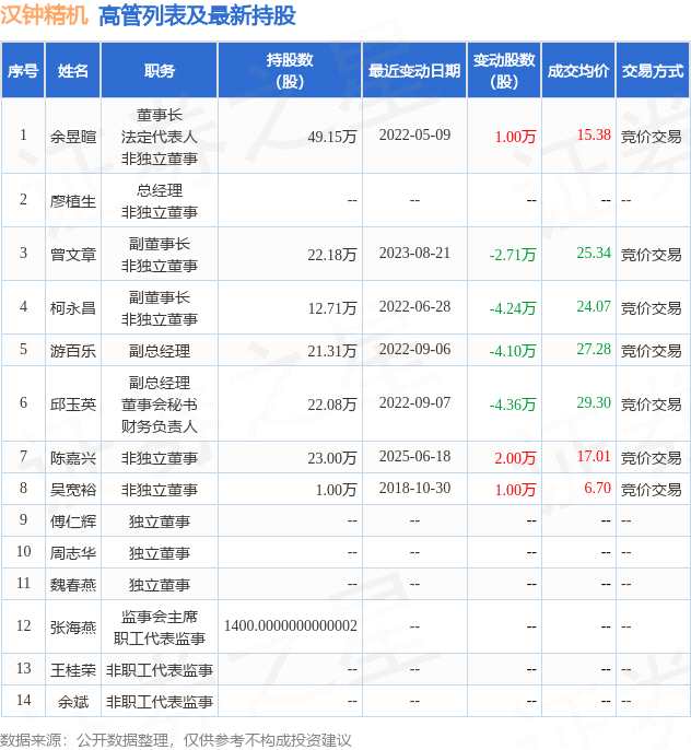 漢鐘精機(jī)的高管列表及最新持股情況如下: