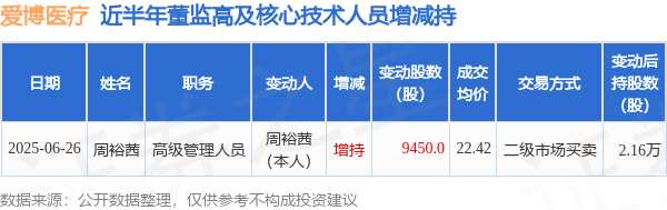 摘要: 消息,根據(jù)6月30日市場公開信息、上市公司公告及交易所披露數(shù)據(jù)整理,愛博醫(yī)療(688050)最新董監(jiān)高及相關(guān)人員股份變動情況:2025年6月26日公司高級管理人員周裕茜共增持公司股份9450.0股,