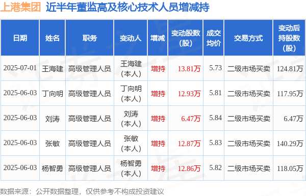 消息,根據(jù)7月1日市場公開信息、上市公司公告及交易所披露數(shù)據(jù)整理,上港集團(tuán)(600018)最新董監(jiān)高及相關(guān)人員股份變動(dòng)情況:2025年7月1日公司高級(jí)管理人員王海建共增持公司股份13.81萬股,占公司總股本為0.0006%。變動(dòng)期間公司股價(jià)上漲0.53%,7月1日當(dāng)日收盤報(bào)5.74元。